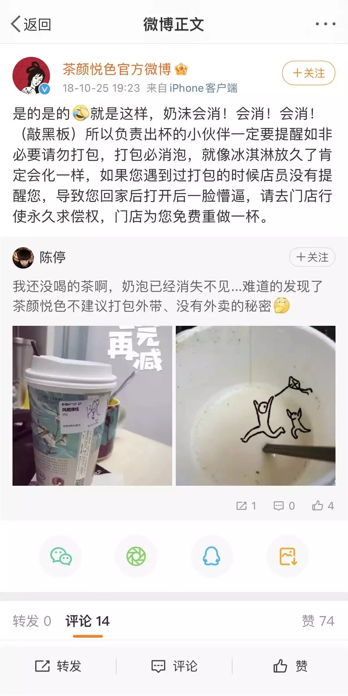 2018年10月,有消费者在微博发文称“还没喝的茶奶泡已经消失不见”。茶颜悦色官方微博转发回复“就是这样,奶沫会消!会消!会消!打包必消泡,就像冰淇淋放久了肯定会化一样。”