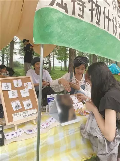 为了更好地服务来露营的市民,“开摆”前王琪瑶还特地了解了雕塑园的相关规定,得知不允许出现明火和吊床,便和同学们商量,在各自的摊位中侧重以学生们设计并自制的手工艺品以及一些食物成品为主,并鼓励大家发挥创造性,加入各自的摊位特色。“摊位一支起来,就受到了市民们的欢迎,特别是有一位摄影专业的学妹,她的摊位一边卖热狗、一边还为市民拍美照。当天大家虽然盈利不多,但是都玩得很开心。”