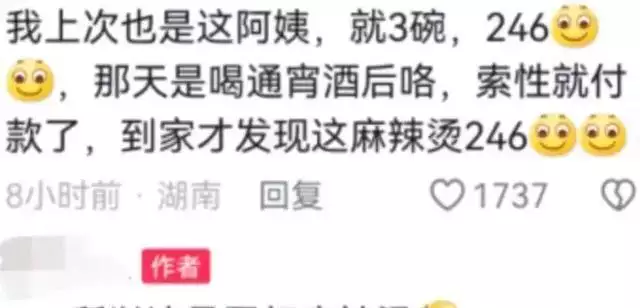 有位曾在这个摊主那里吃过的麻辣烫的网友说话了:有回曾在这个阿姨这里点了3碗麻辣烫,付款是246元。平均算下来一碗也要82块。