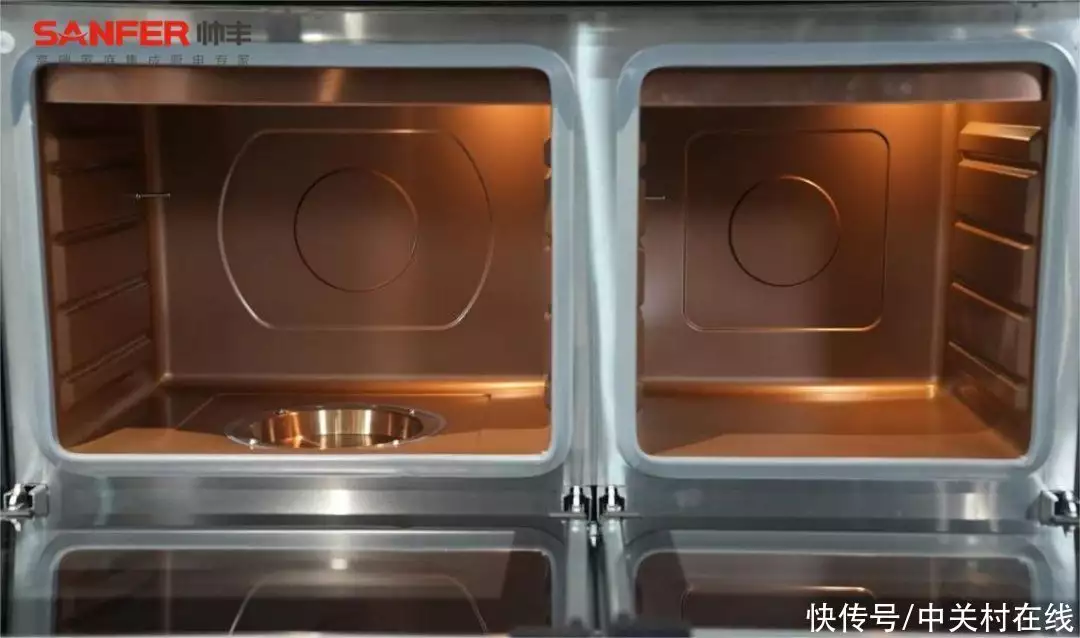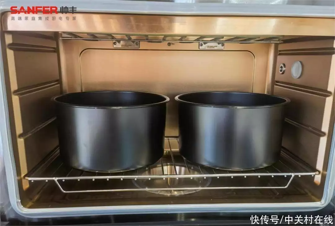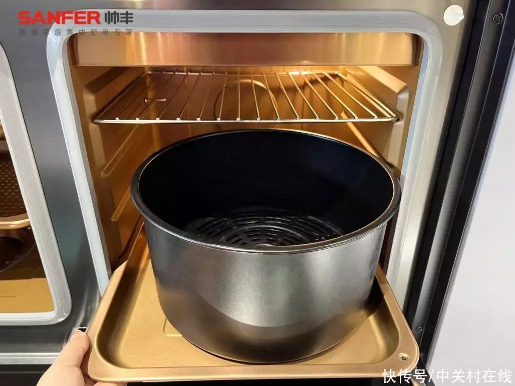与传统蒸烤箱不同的是,帅丰集成灶蒸烤箱配备了双动力循环加热风扇,受热更均匀,里面可以放置2个空气烤锅,从而实现一腔双烤。平时做烤鸡、烤时蔬等食物,一次性放进去也不会串味,烤制食品不用翻面,一次出锅,很方便!