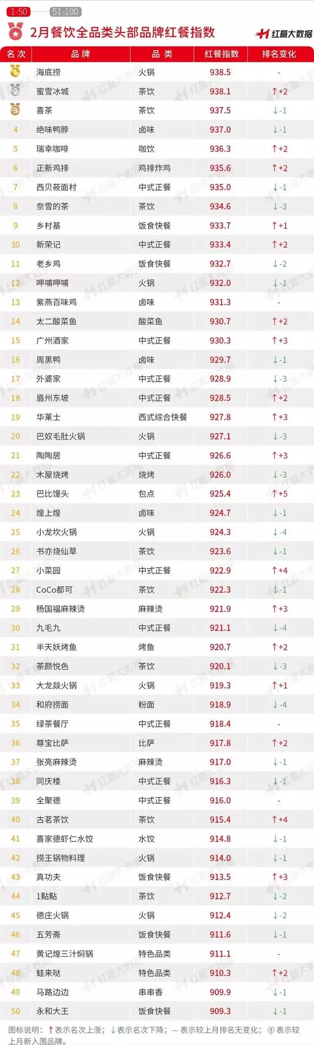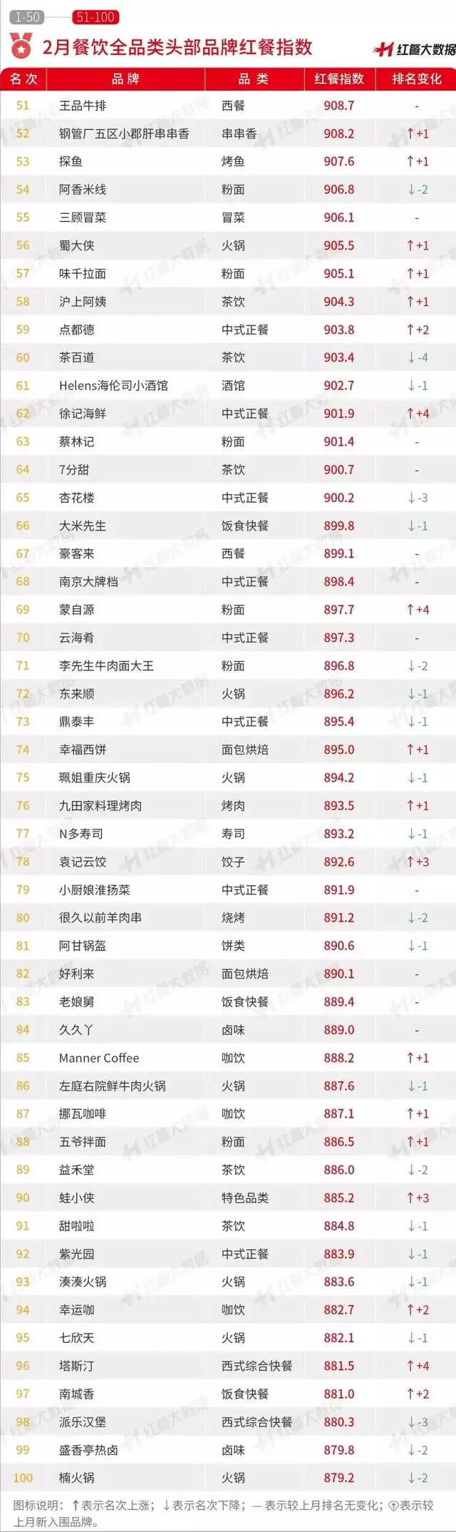 总体上看,在2月“餐饮品类的品牌力百强榜”中,名次上升的品牌有37个,名次下降的有47个,名次不变的有16个,本月度无新上榜品牌。
