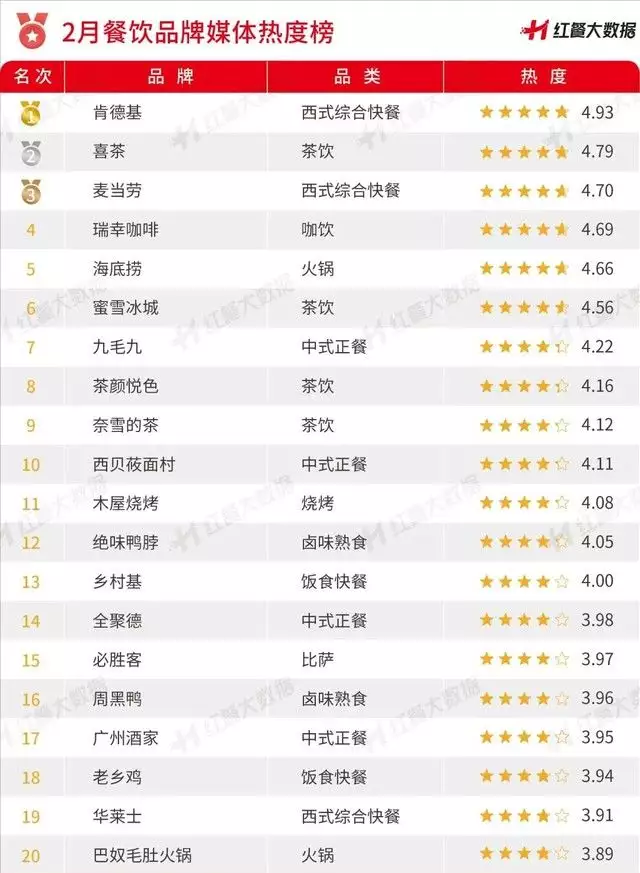 餐饮品牌媒体热度榜,主要通过分析品牌在微信、微博、各大新闻网站等媒体平台上的搜索以及曝光情况来做排名。2月,媒体热度榜前三品牌分别是肯德基、喜茶以及麦当劳,跟随其后的还有瑞幸咖啡、海底捞、蜜雪冰城等品牌。