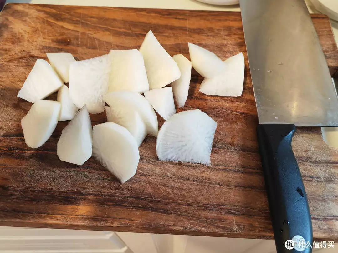 步骤一,羊腿肉拿回家要大块去血水,放在冷水中浸泡出血水,血变红倒掉。如果不喜欢膻味,建议多冲两次血水,然后切成小块放清水浸泡,放两勺白酒。步骤二,白萝卜去皮切滚刀,姜切片,大葱切段,准备好各种调料备用