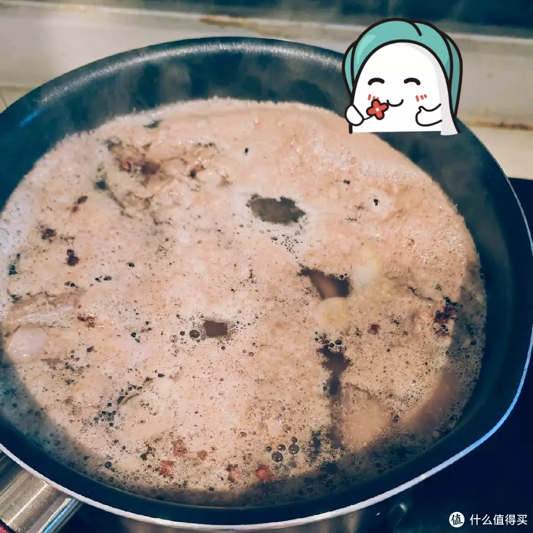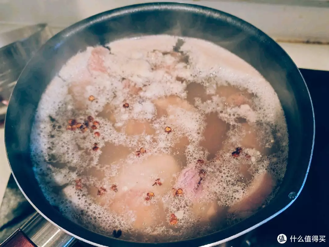 步骤三,水中放几片姜水,放入羊肉,大火烧开,用勺子撇去肉末,直到汤变白澈,盛出备用。
