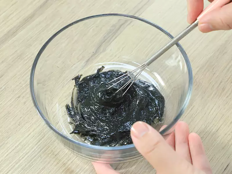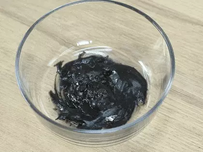 4.蛋黄中倒入黑芝麻酱,搅拌均匀。