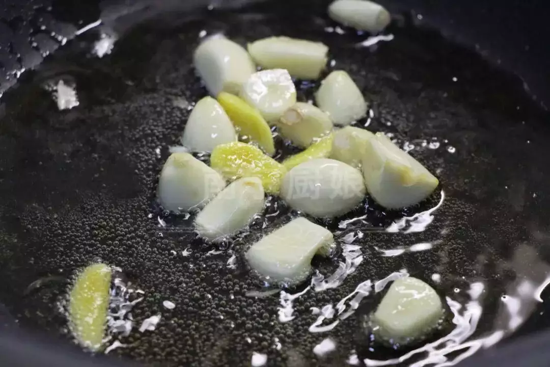 第一步:起锅,在锅中倒入适量花生油,开小火烧热锅中油,然后把大蒜和生姜倒入爆香,注意不要炸糊了,只要出香味就可以了。