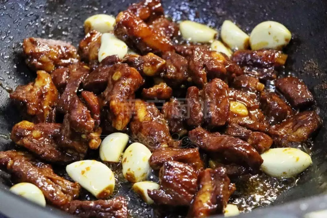 第五步:开盖,放入大蒜,翻拌一下,防止粘锅,继续盖上锅盖,待锅中汤汁见底时,调大火收汁,让排骨裹上一层浓郁的蒜香汁。