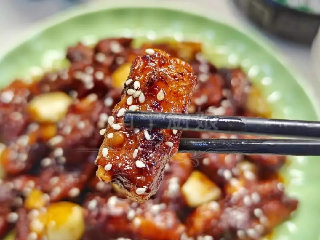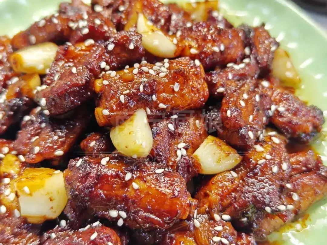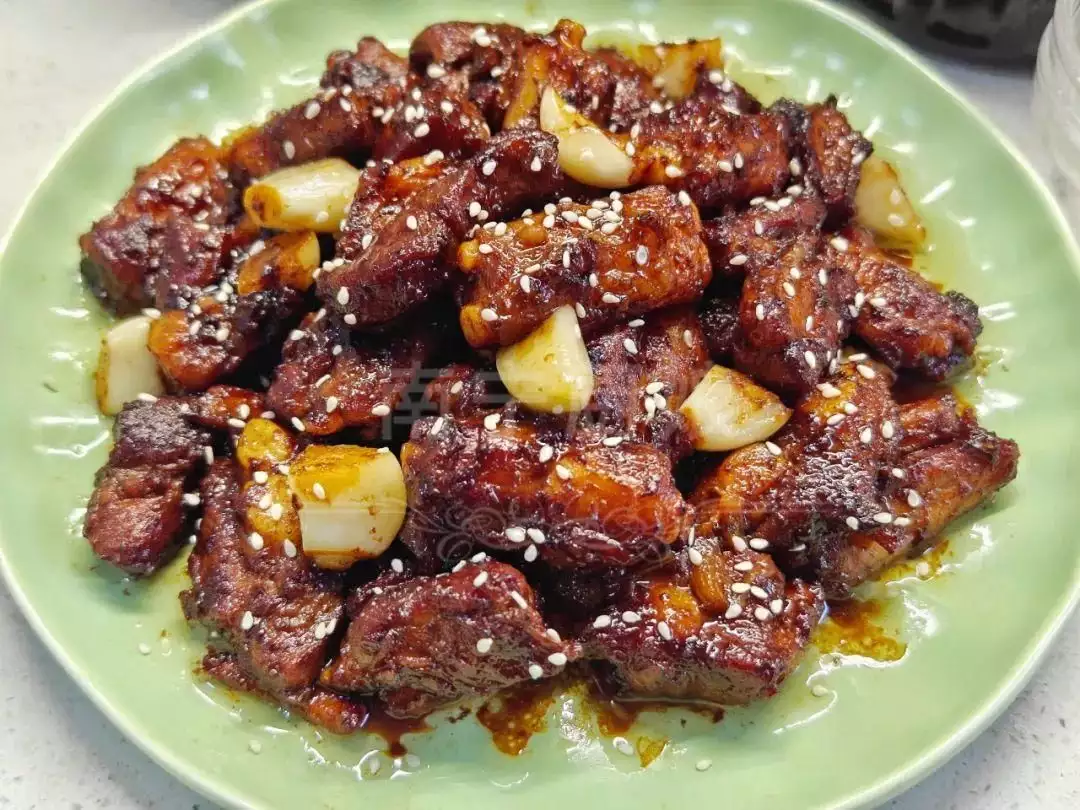 这道菜的色泽红亮,排骨酥软,大蒜香辣,白芝麻香酥,各种食材的味道完美融合,令人垂涎三尺。