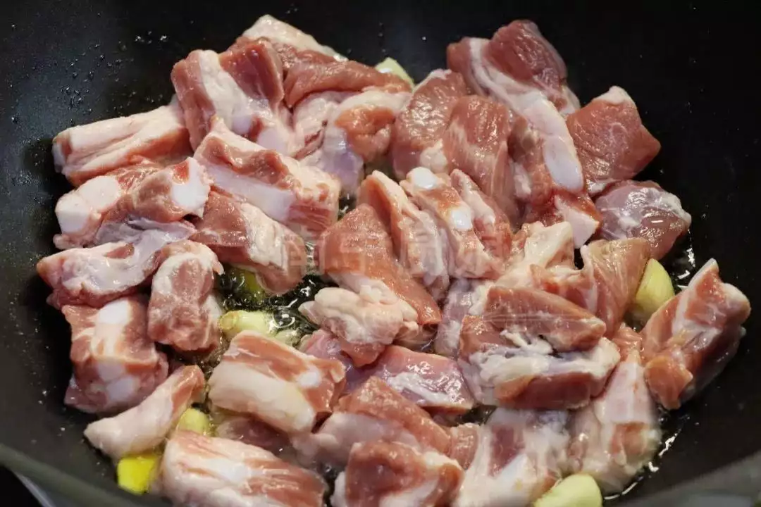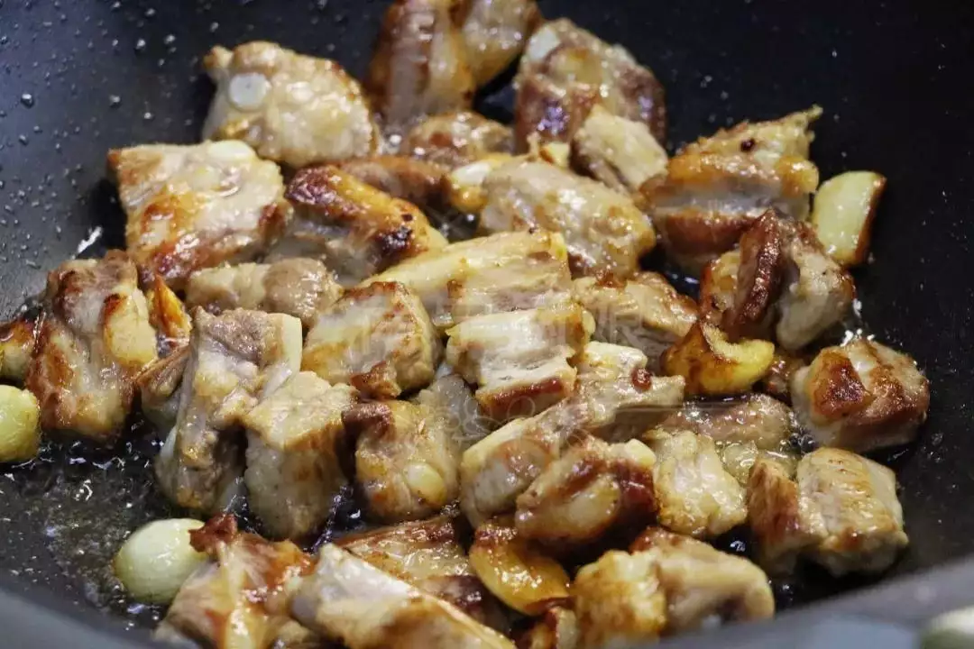 第二步:把排骨倒入锅中,调大火爆炒,炒至表面有微微焦黄,这样可以锁住排骨的汁水,让排骨更香更嫩。