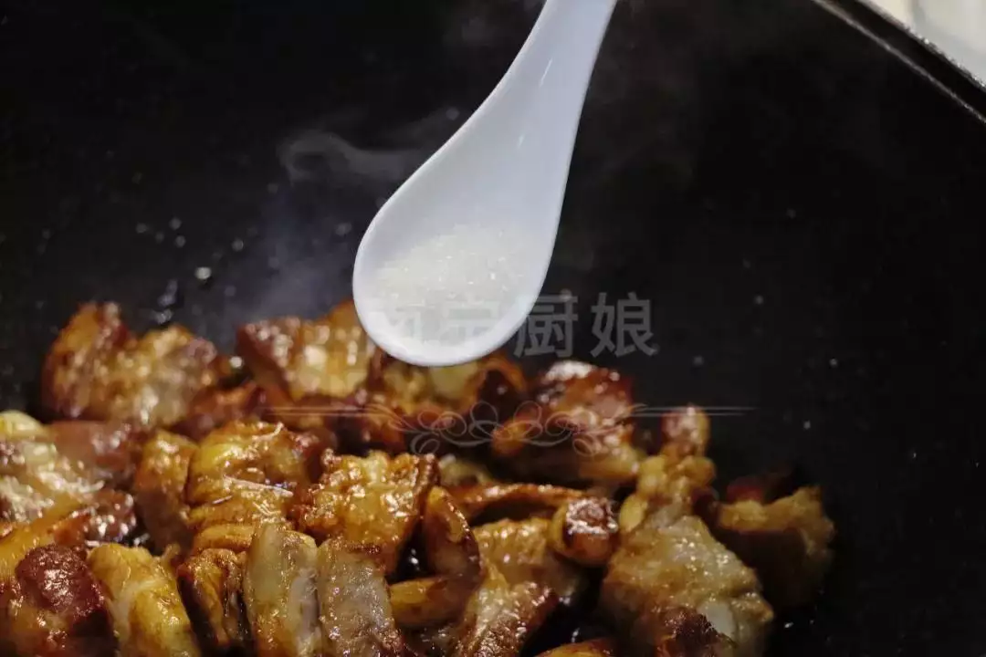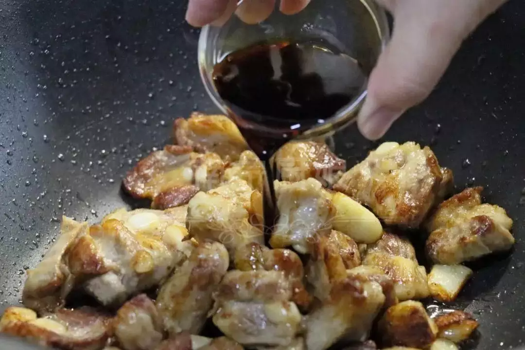 第三步:放入生抽、老抽、白砂糖,翻炒均匀,让排骨上色,同时调整味道,根据个人口味可以适当加一些盐或者鸡精。