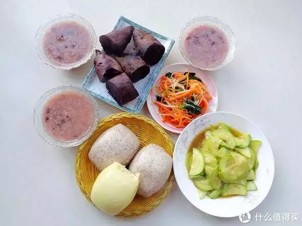 用电压力锅预约的红豆红枣粥,用蒸锅蒸了紫薯和杂粮馍,一边就可以炒菜了,我爱吃拌的三丝,就随手焯水拌一拌了,作为早餐小菜真不错。不到20分钟就可以吃到嘴的早餐,三种主食,两种菜,满意吗?