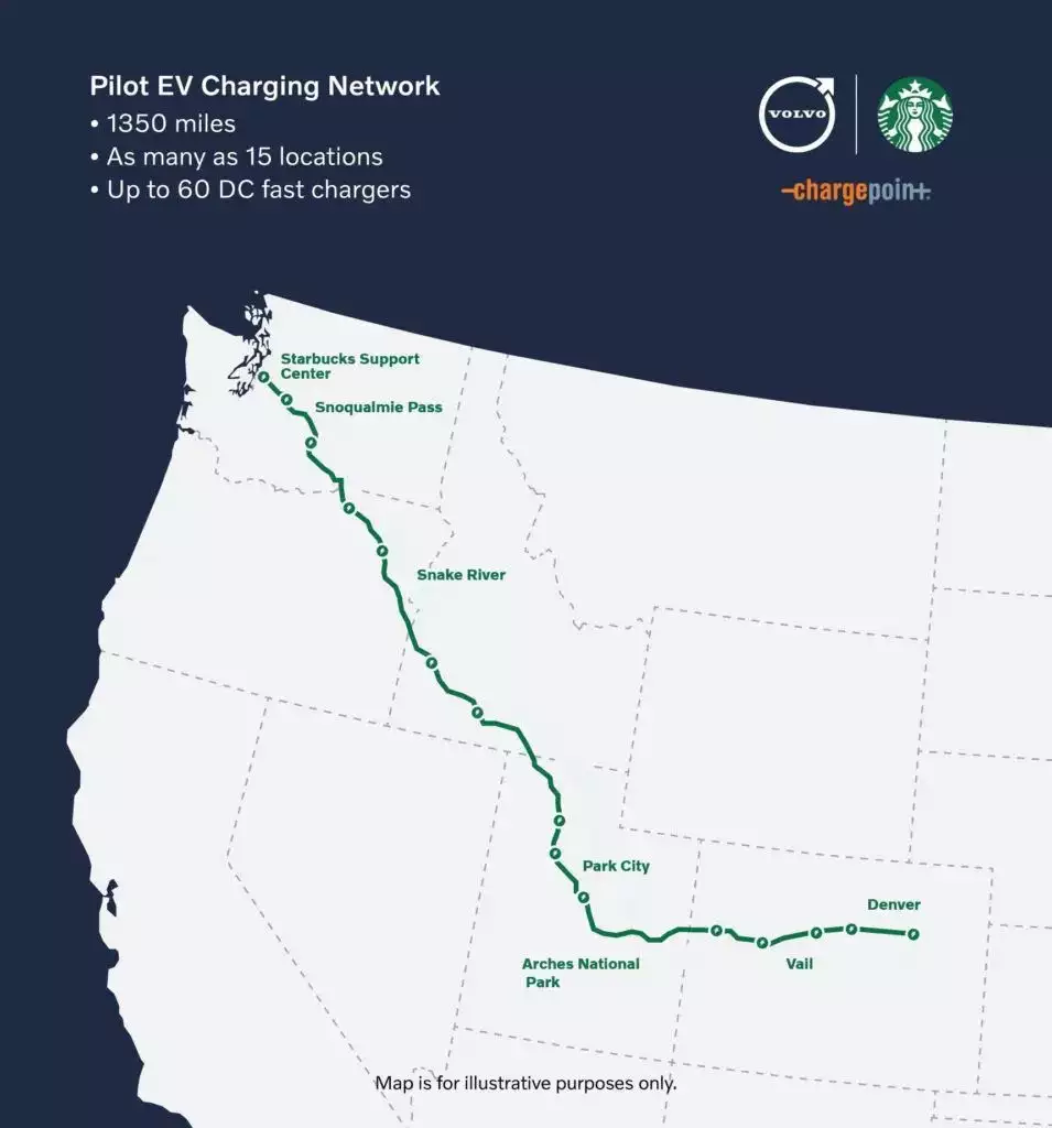 美国15家星巴克门店将安装60个沃尔沃品牌的ChargePoint直流快速充电桩,从丹佛到咖啡公司的西雅图总部,沿着一条长达1350英里(2170公里)的路线进行设置。
