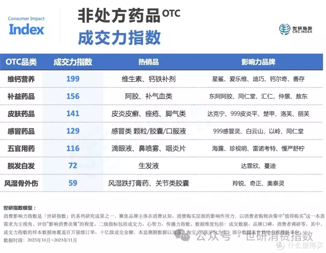 世研指数对主流电商平台的成交数据分析发现,在非处方药中,成交力指数第一的是维生素/矿物质类的药品,其次是以传统滋补药材为原料的补益类药品。