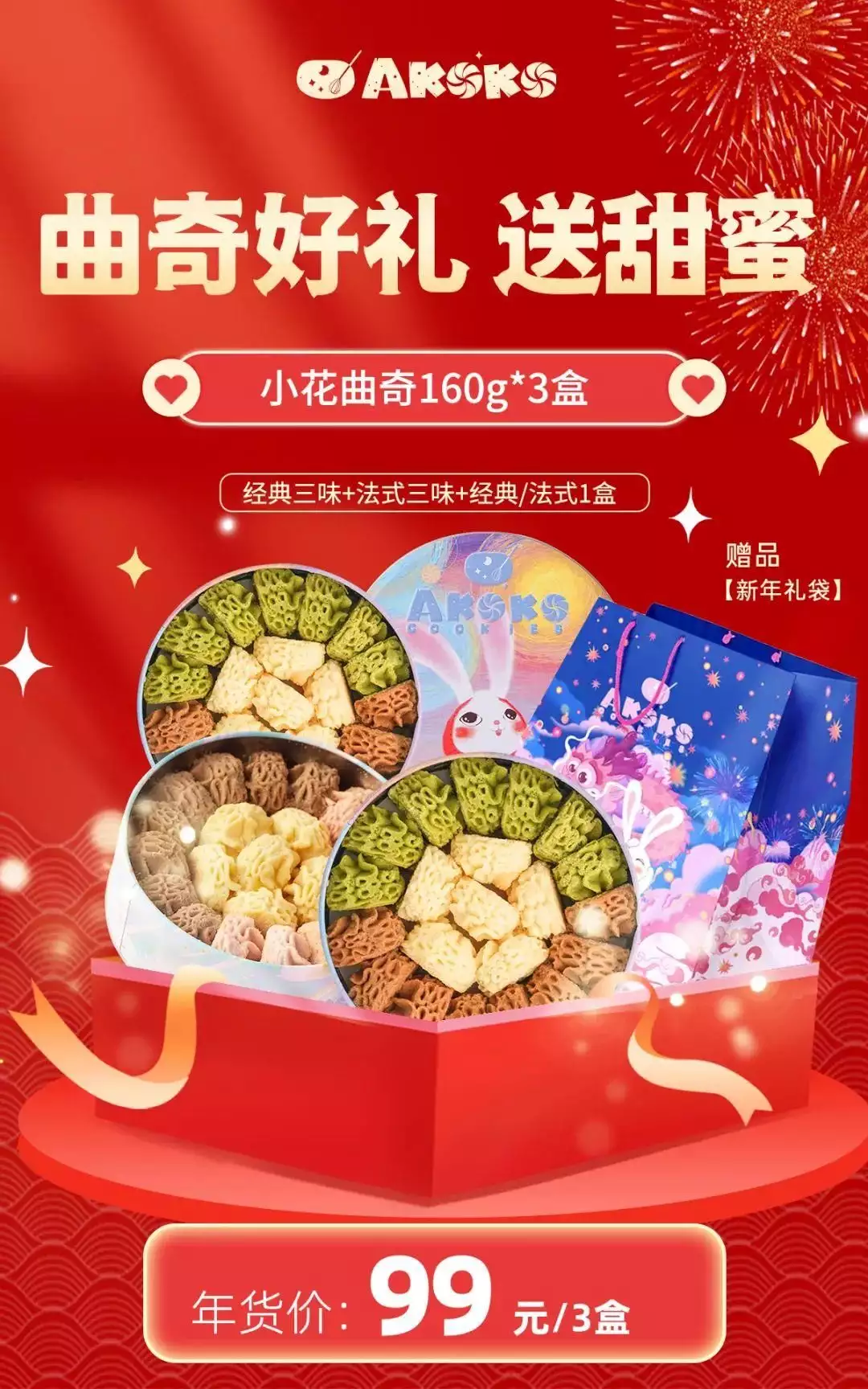 3盒曲奇160g只要99元,老粉都知道,AKOKO曲奇平时大大小小的活动也有,但是这样大的力度确实很难得。平时160g装的单盒就要卖到59元,现在买99元直接抱走3盒!现在购买,还送浪漫礼袋~