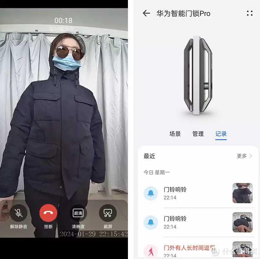 华为也可以通过内门显示屏和手机了解门外情况,同时支持远程可视对话。遭遇室外人员异常停留,也会进行视频抓拍和警告推送,方便用户实时了解家中屋外情况。