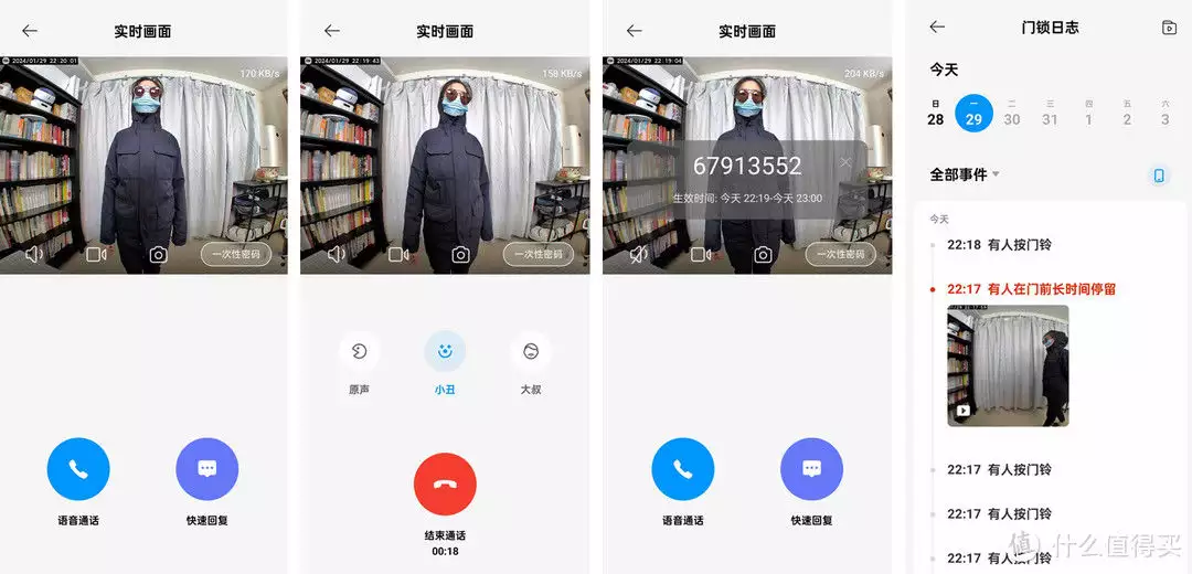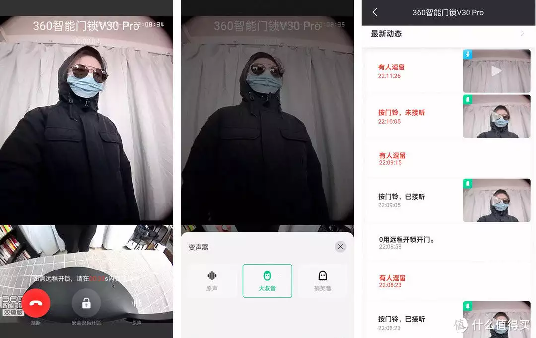 360的1080P分辨率还是比较够用的,弱光下的效果也可以说是基本够用。独居女性用户通过观察猫眼,还可以搭配变声功能和外面的人进行沟通,领取外卖什么的也更加安心。系统也会监控门口停留的人,并进行视频录制和APP推送。即使家中无人有安全隐患都可以随时了解,并做出相应的防范。