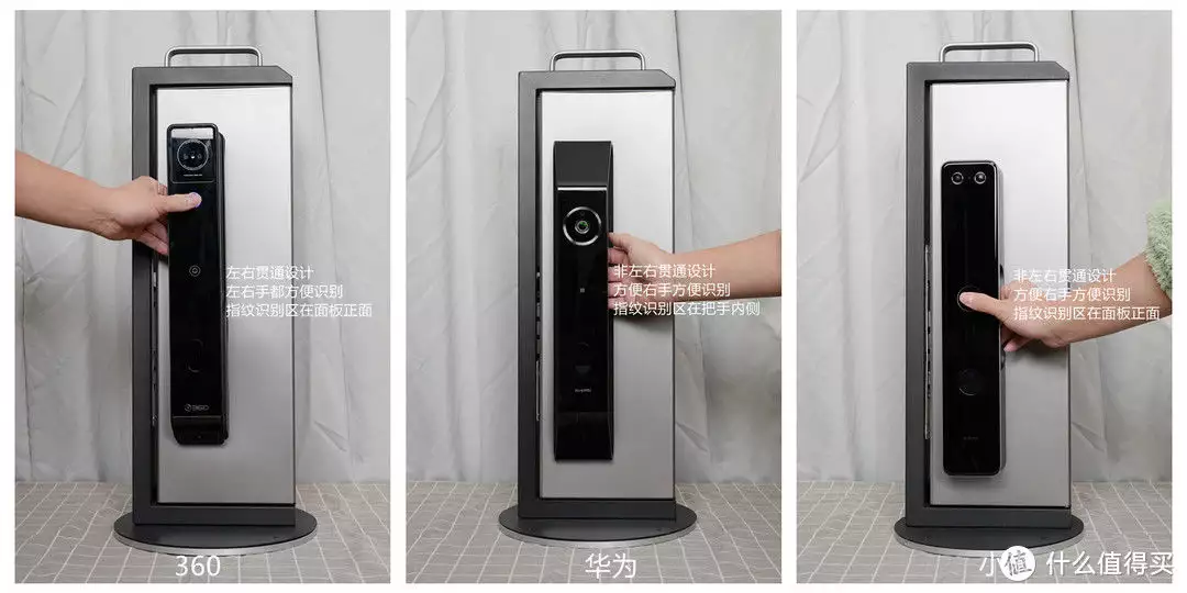 指纹识别上这三款产品设计稍有不同。360的门锁把手是左右贯通的,同时指纹设计在外门锁面的正面,可以实现左右手快速识别,个人认为是三款产品中指纹体验设计最佳的方案。华为和都采用的采用的非左右贯穿把手设计,逻辑上来说对右手习惯的小伙伴来说比较友好。华为的指纹识别设计在把手内侧,开门和识别基本可以一并完成,体验比较舒服。小米的则世界在外门锁面的正面,需要先识别指纹再开门,流程上会稍微繁复一些。