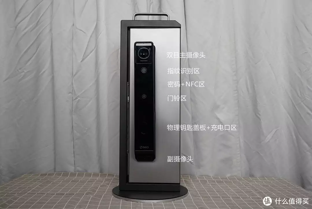360这款智能锁外门锁面采用了一体化玻璃面板设计,搭配黑色铝合金工艺外壳,兼顾外观和耐用性。整体设计上简约大气,可以轻松和各类家居风格搭配。外门锁面从上到下结构依次为双目主摄像头、指纹识别区、密码+NFC区、门铃区、物理钥匙盖板+充电口和副摄像头。主副双摄像组设计算是很有意思的亮点,可以有效增加观看的视角范围。