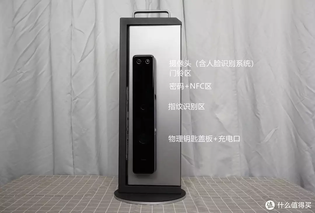 再来看看小米的设计,总的来说小米的风格比较接近360。一体化黑色玻璃盖板设计,质感表现十分不错。小米的外门锁面较厚,可以轻松看到磨砂工艺的灰色铝合金面板,兼顾耐用性和质感表现。外门锁面从上到下结构依次为摄像头(含人脸识别系统)、门铃区、密码+NFC区、指纹识别区、物理钥匙盖板+充电口(支持无线应急供电)。