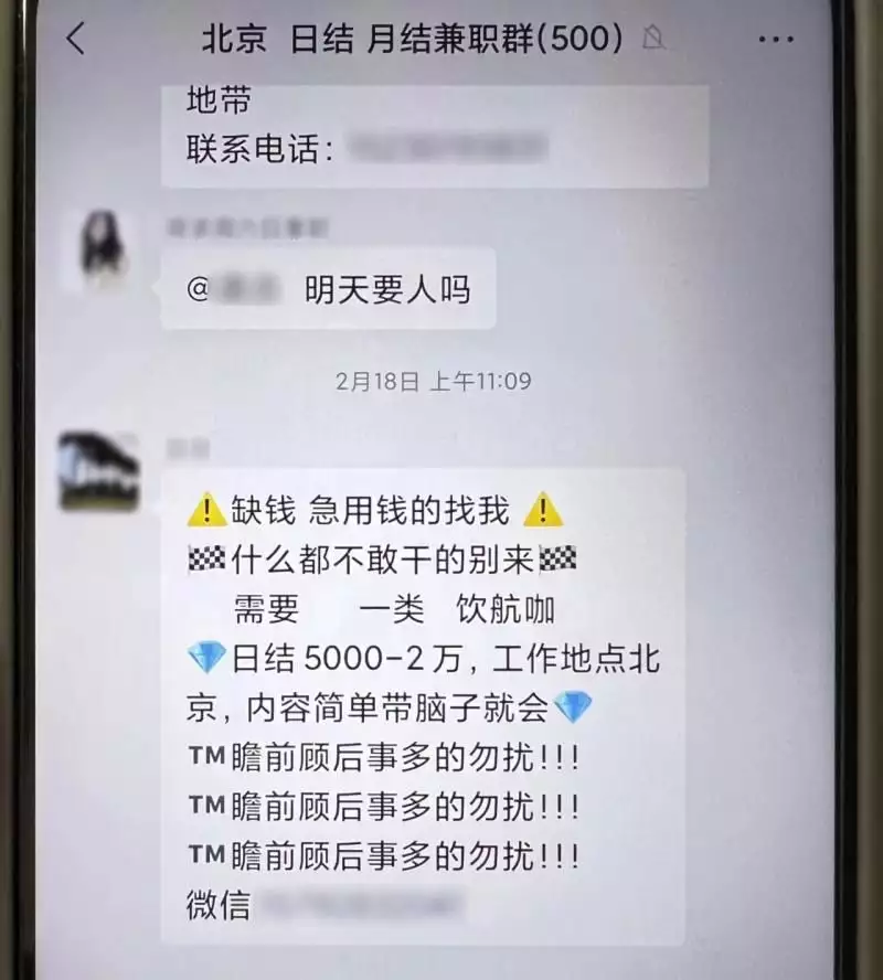 “缺钱、急用钱的找我!日结工资5000元至2万元!”2023年2月18日,家住丰台区的陈某在自己的兼职工作群中收到了这样一条信息。面对高额的报酬,陈某主动添加了对方微信。经过一番交谈,双方约定在通州区张家湾镇一医院附近见面。