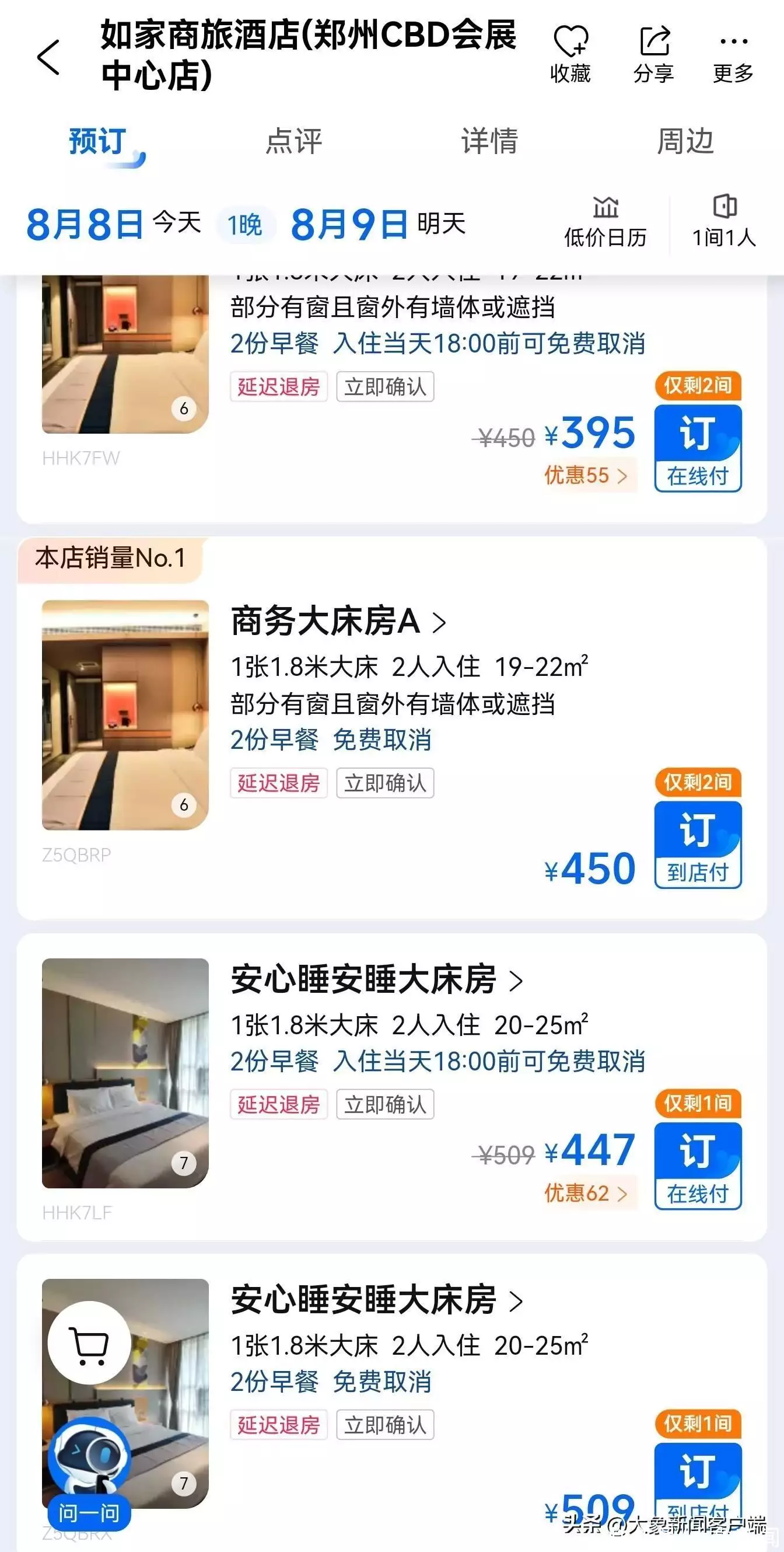 8月8日16时,大象新闻记者通过携程查询获悉,城市核心地段的酒店房价较高,如郑州CBD会展中心的如家商旅酒店,当日可预订房型的价格在395元-509元每晚;汉庭酒店(郑州郑东新区中州大道店)当日可预订房型的价格在352元-445元之间。而其他城市的住宿价格也居高不下,比如今年暑期旅游大热门北京,其核心地段的汉庭等酒店价格在千元上下,如汉庭酒店(北京天安门店)在8月中旬房型的价格930元到1025元每晚不等。