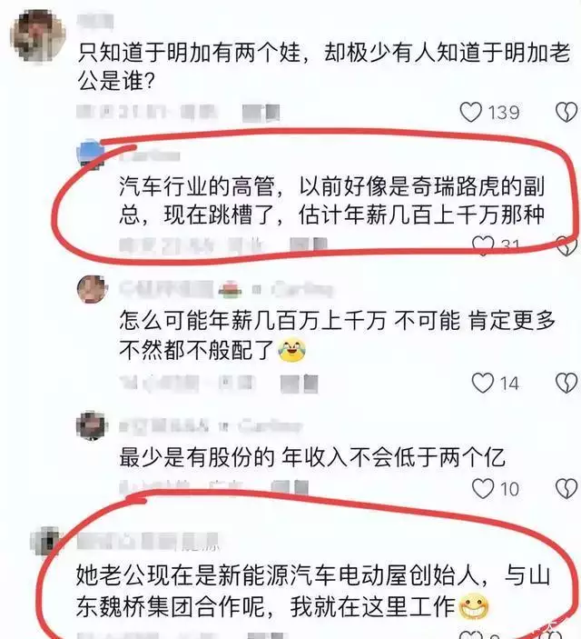 有知情网友透露,于明加的老公实力不凡,是某新能源汽车的创始人,身价早已上亿,算是年轻有为的大老板。