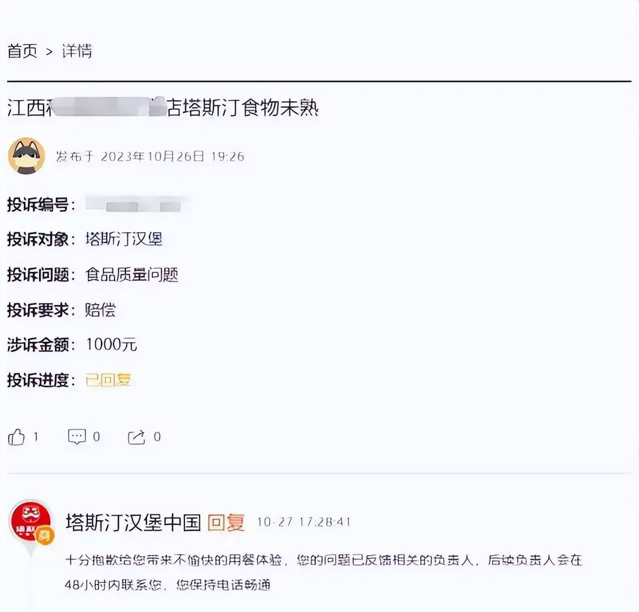 9月12日,有网友发文称“在塔斯汀点了两个汉堡,吃到了生肉”;“找平台客服介入,客服说无法申请更多只能给您返十块的券”。