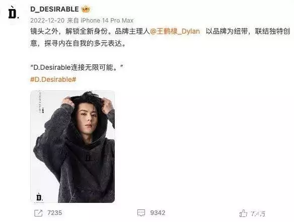近些年,尤以流量明星为代表,入局做潮牌成为趋势。如杨超越的BABT,黄明昊的TWOEX2,以及去年因《苍兰诀》大火的王鹤棣,也推出了个人潮牌D_DESIRABLE。