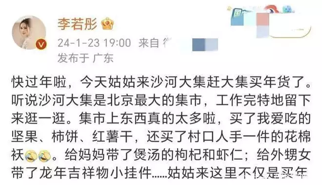 在这个瞬间,李若彤仿佛成为了时尚界的一颗新星,用实际行动向人们传递了一种“不在乎别人眼光,我活得自在”的态度。 年货扫荡:李若彤在市场的别样一天