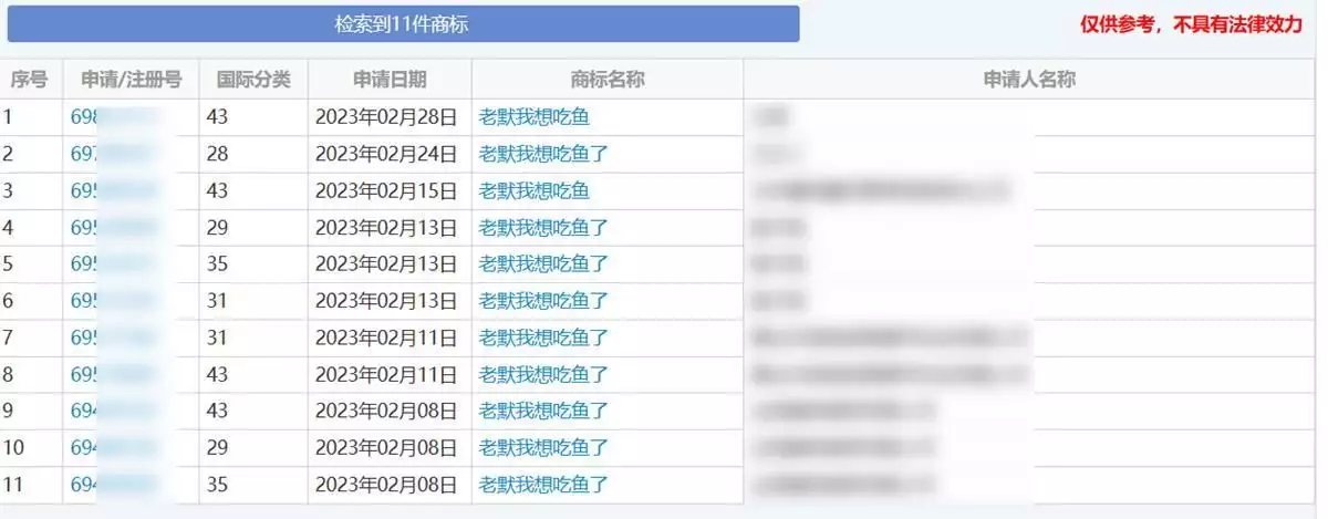 湖北征和律师事务所董文明律师则表示,目前,经过查询尚未发现“老默烤鱼”“启强烧烤”的注册商标注册成功,因此,就目前来说店家的行为尚难以构成商标侵权。另外,通过检索国家知识产权局商标局数据,发现目前有大量主体提出“老默我想吃鱼”和“老默我想吃鱼了”等商标的注册申请,至于是否能通过审核尚有争议。