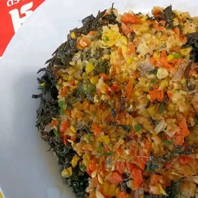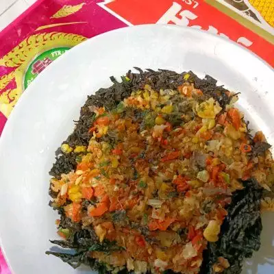 10、可切成小块儿享用,一口下去,紫菜的酥脆,虾滑的Q弹,还有果蔬粒在口中的跳动,太爽了!配上一碗白米饭,再加一杯牛奶红枣热饮,调逗味蕾的暖胃暖心,喜欢的朋友们不妨一试这道家常菜。