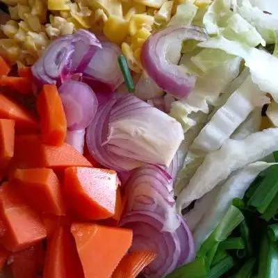 1、玉米粒小香葱,胡萝卜和白菜洋葱切快后切碎(白菜攥一下水)