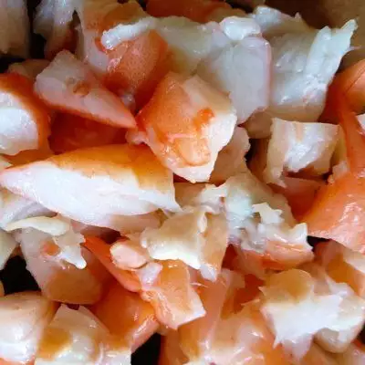 2、虾滑没有买到,只自己动手制作了。(虾滑的制作方法:将鲜虾仁切粒后剁成虾泥,然后再加入玉米淀粉糊和蛋清和盐,朝一个方向搅拌均匀至黏稠上劲。)