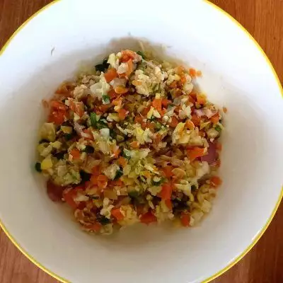 杂蔬的水份得去掉,虾滑和菜蔬要充分搅拌均匀啊。