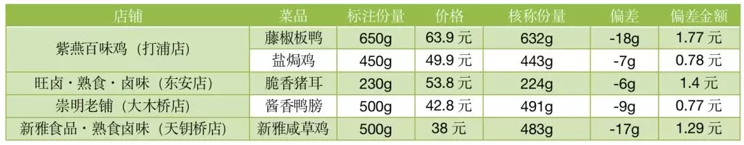 上海市消保委举例称,如紫燕百味鸡(打浦店)的藤椒板鸭,标注为650g,价格为63.9元,按规定其允许的最大负偏差为2g。但其核称份量为632g,比标注份量少了18g,低于允许的最大负偏差。