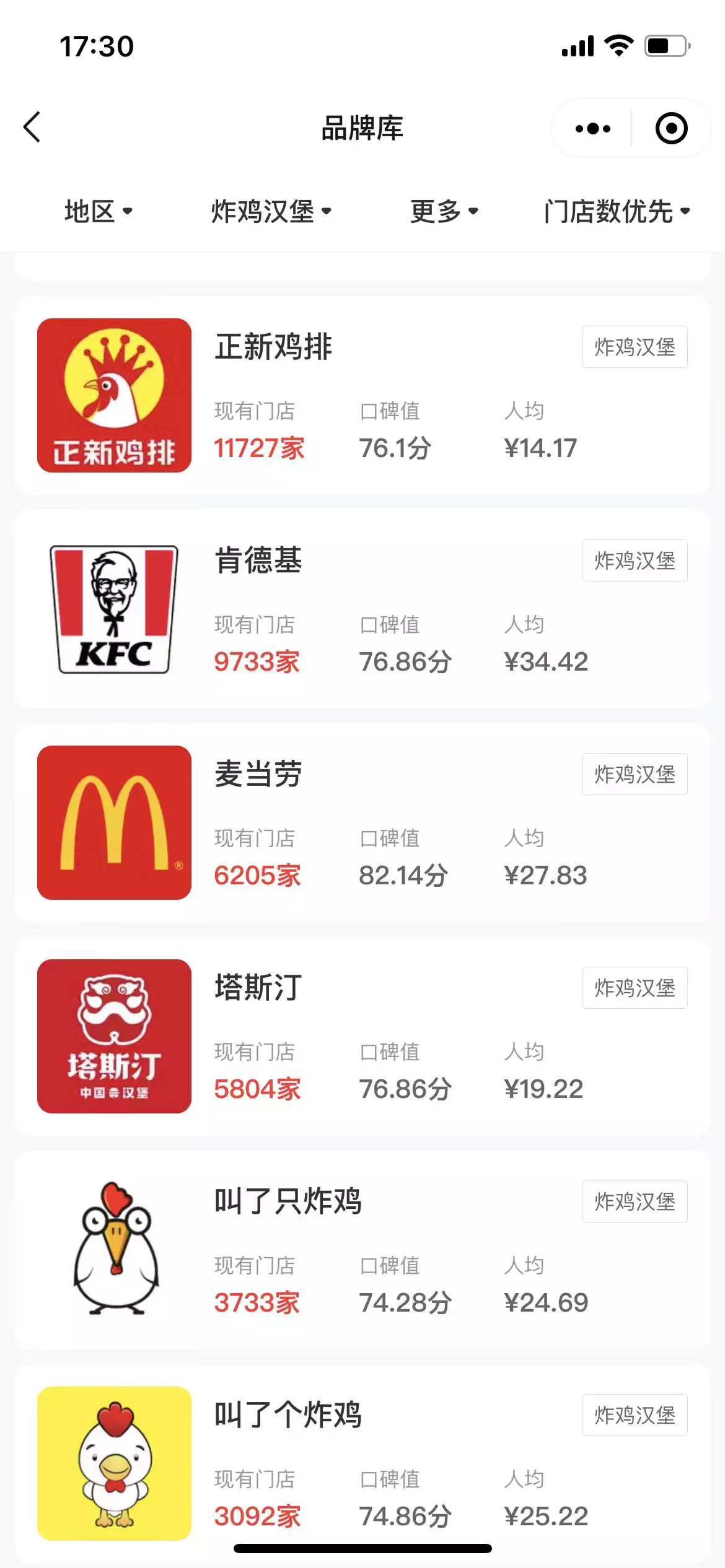 可以从图中看出,德克士和排名前四名的品牌门店数据还有很大的差距。门店数据排名第一的是正新鸡排,是国产品牌。客单价14.17。占领了大量低价位消费市场。