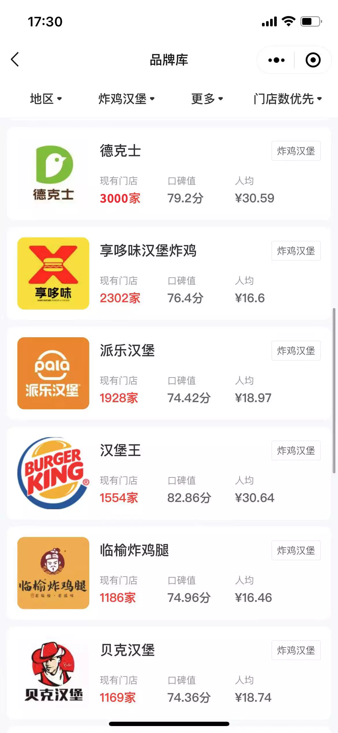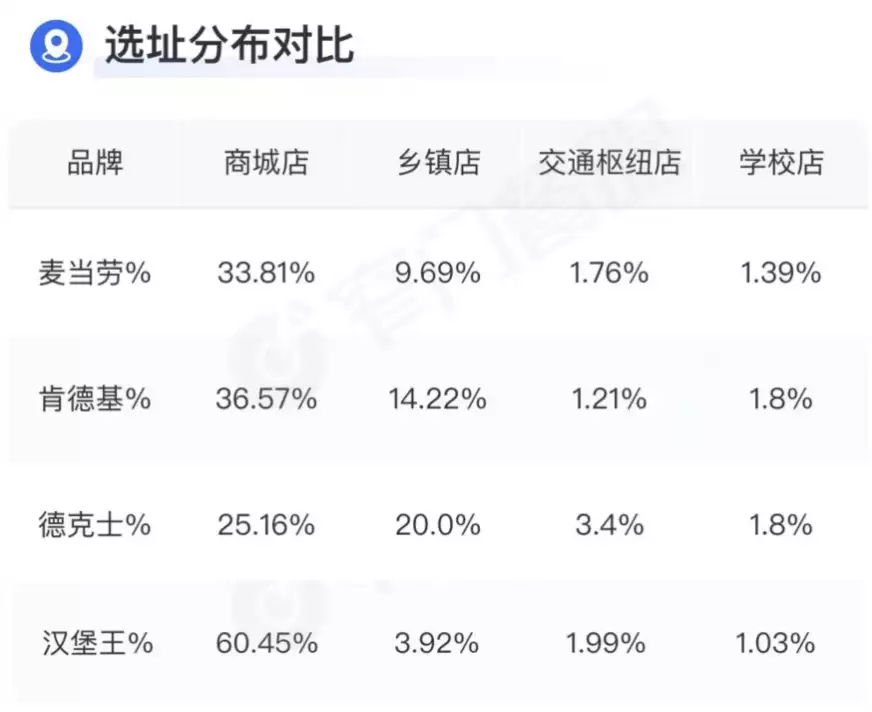 可以看出麦当劳、肯德基、德克士、汉堡王。基本上选址主要是商城店德克士的乡镇店数据排名第一,说明德克士乡镇下沉市场也是主要的选址方向。