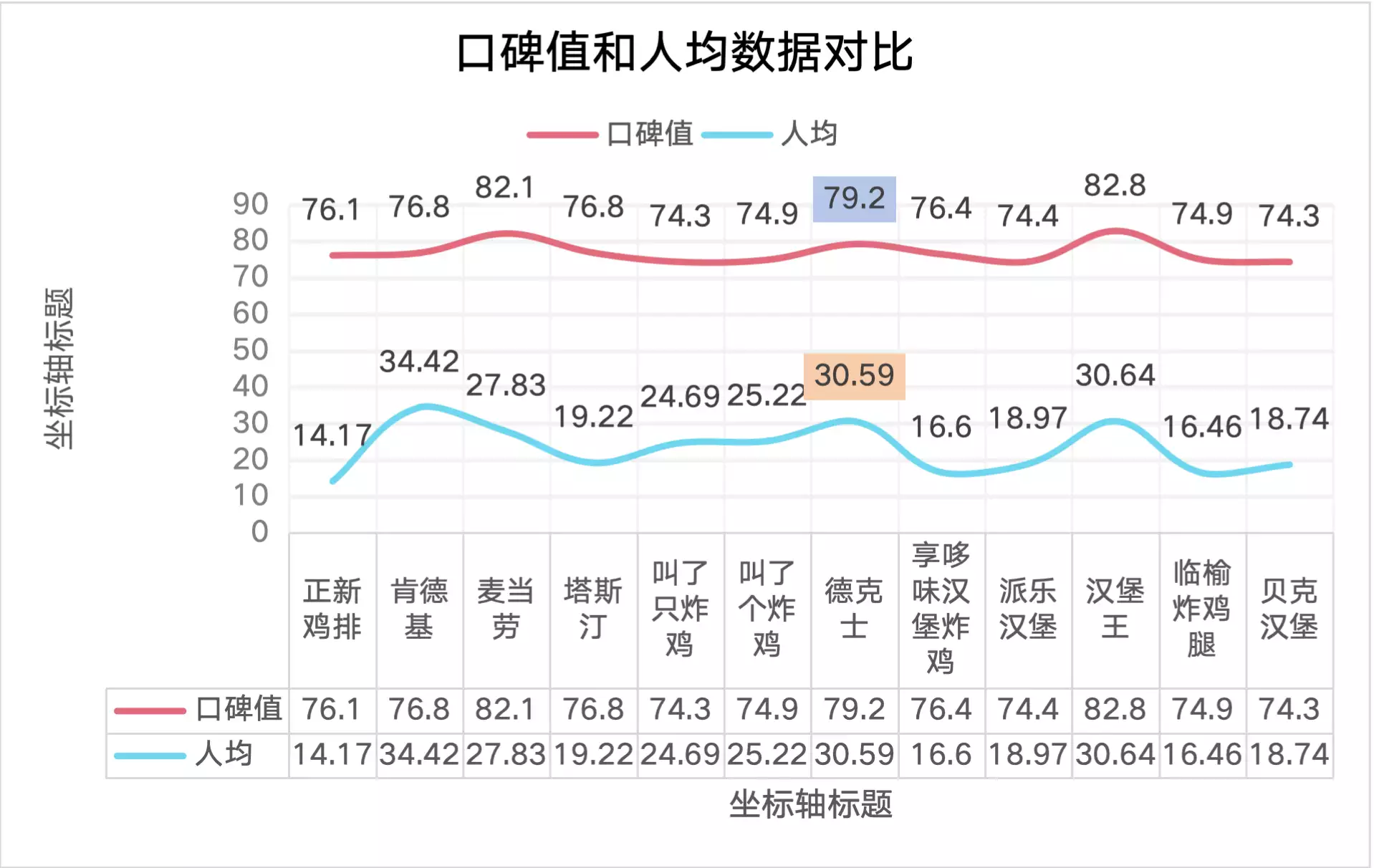 德克士的口碑值79.2,排名第三,人均值数据30.59,排名第二,综合看来德克士处于和肯德基、麦当劳、汉堡王属于相同价位的竞争关系。