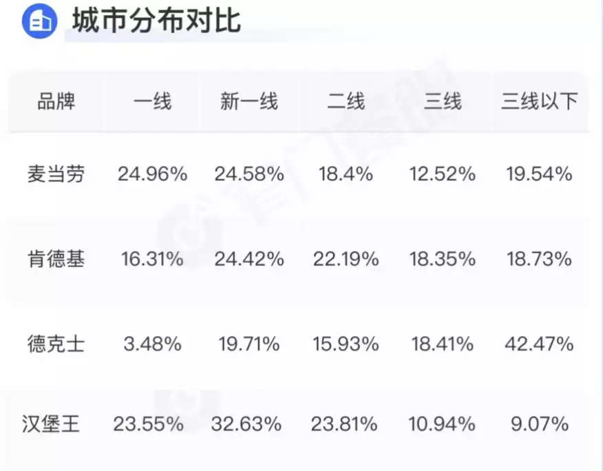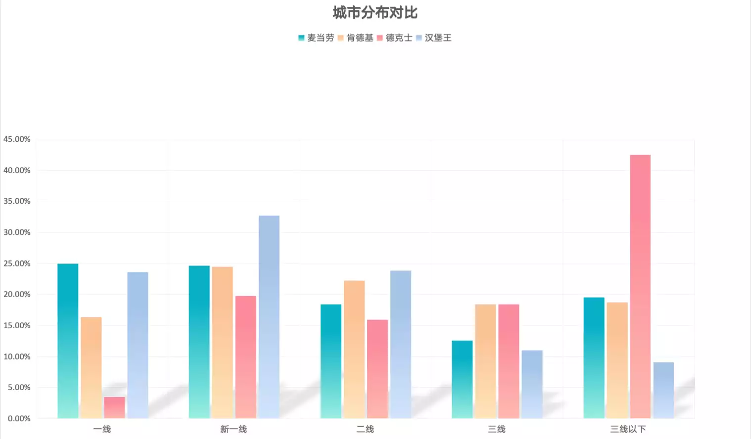 从城市分布对比可以看出德克士主要集中在三线以下城市。 汉堡王主要是新一线城市 麦当劳主要在一线和新一线 肯德基则以新一线和二线城市为主,且肯德基整体呈现均衡分布。