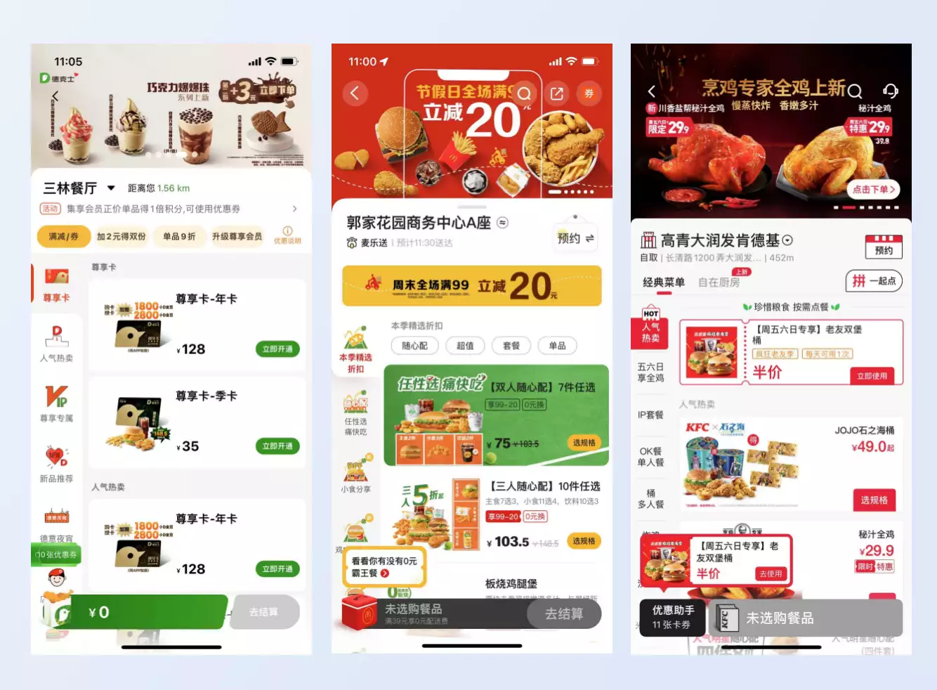 德克士点单的首个类目是尊享卡,麦当劳是精选折扣、肯德基是人气热卖 可以从这个页面看出,德克士首推让用户先去购卡再消费。重点推尊享卡。