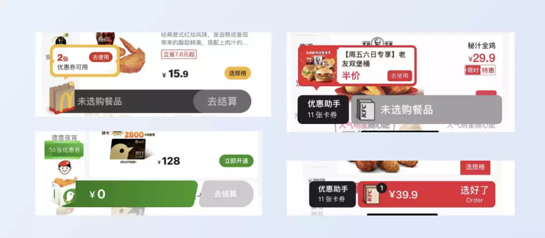 加入购物车栏目肯德基的数据层级最清晰,用户体验效果最好主要体验在,提示的券信息清晰,交互细节做的最好。开始是未选购餐品,添加餐品之后交互动效和文字都改变。文字变成了选好了,还有英文提示。