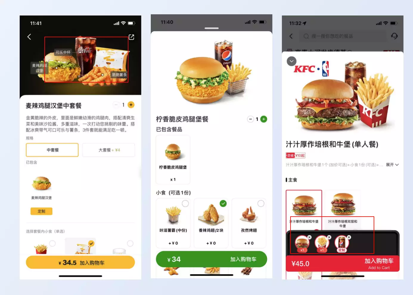 在套餐随心配中肯德基和麦当劳都做了,选择不同的套餐内的单品之后图片会发生改变。这里的小交互可以很好的解决品类多,用户可以一眼就可以看到自己选了那些套餐的单品组合。