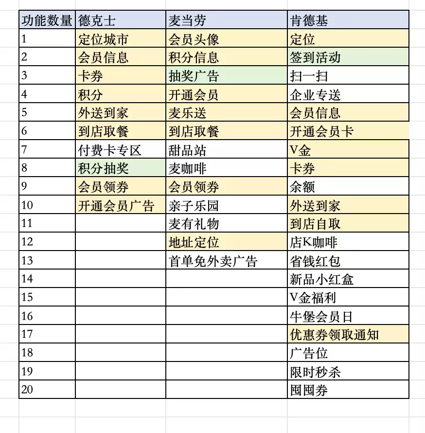德克士首屏有10个承载的二级功能,麦当劳13个,肯德基20个。 从这里就可以看的出来,肯德基的APP功能细分的最多。 在定位这个栏目麦当劳、肯德基都直接定位到了城市具体地点,而德克士只定位到了城市。表格中标黄色部分是大家都拥有的功能。绿色是基本类似。白色部分就是有差异的地方。