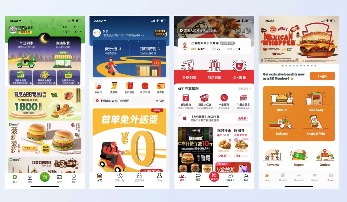 1. 首页汉堡王没有做中文版APP,但是有点单小程序。现在就具体分析,德克士/肯德基/麦当劳他们的首页各有什么功能吧。因为APP首屏是最关键的位置,我们就只分析首屏的区别吧!