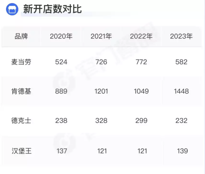 可以很清晰的看出,肯德基的门店数据一直呈现快速增长趋势。特别是2023年,新增加门店1448家,且今年还没有完全过去,数据还会增长。可以从整体数据看出。国际品牌麦当劳和肯德基正在中国市场快速扩张。