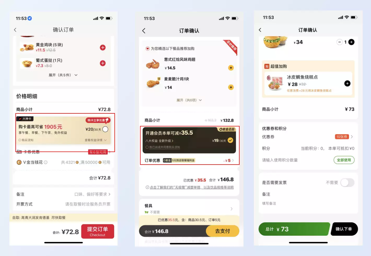 在订单确认页面肯德基和麦当劳都有会员卡购买功能。可以再确认订单环节增加用户购卡的几率。肯德基和德克士可以使用优惠券和积分 ,麦当劳则是需要开通会员卡后才可以选择优惠券。