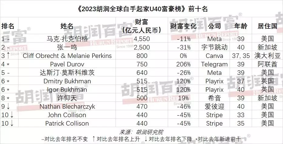【胡润全球白手起家U40富豪榜发布,中国以18人排名第二】胡润研究院发布《2023胡润全球白手起家U40富豪榜》显示,截至1月16日,全球共有59位40岁以下(含)且白手起家的十亿美元企业家。其中,美国23人、中国18人,分列第一、第二。具体到个人,马克•扎克伯格以4550亿元人民币财富,成为全球40岁以下白手起家首富。抖音创始人张一鸣以2500亿元人民币财富排名第二。胡润表示,全球最成功的U40企业家,平均用了不到6年时间赚到第一个十亿美元,主要是他们中大多数人连续创业者,平均在24岁时开始创业,27岁时创办现在的公司。(上海证券报)