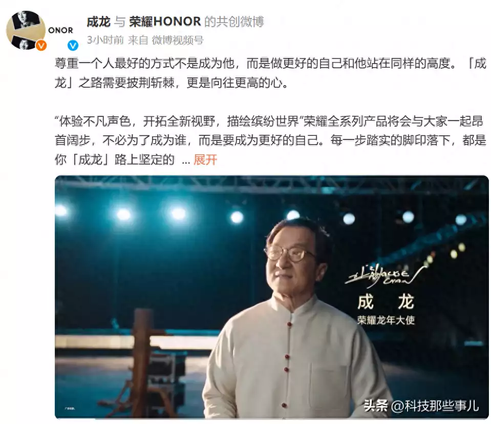 1月11日荣耀Magic6系列新品发布会,荣耀CEO 赵明向在场媒体和观众官宣了荣耀龙年品牌大使——国际功夫巨星成龙,获得了超高的关注度。今天,荣耀又上线了成龙拍摄的最新宣传片。