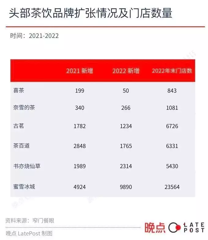 有的联名款更轻,不涉及配料和制作。2022 年 11 月,喜茶与 WPS 联名,用户下单后可以获得 WPS 限定杯套、徽章、贴纸。现在,喜茶的多数联名款是在现有饮品的基础上加入一些体现联名 IP 的元素后所推出的新品。紫苏·粉桃饮差不多是在多肉桃桃基础上加入了紫苏叶,甄果·大橘画梨也是在爆汁大橘基础加入梨果肉。从 2017 年至今,以喜茶为代表的新茶饮品牌尝试了市面上几乎所有水果。今天,葡萄、芒果、草莓、青提、柠檬等一众水果成为中高端水果茶品牌普遍使用的水果。过去,高定价下的喜茶可以不计成本,将油柑、黄皮之类小众水果空运到全国门店。现在,低价和加盟进一步减小了产品的差异化空间。就在喜茶争取高端市场的时候,它的竞争对手依靠加盟模式快速铺开。2021 年 - 2022 年,蜜雪冰城新开近 15000 家门店,门店数量是喜茶的 30 倍。中端品牌茶百道、古茗等也新开超过 3000 家。