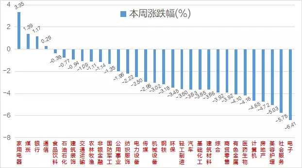 全周维度来看,申万31个一级行业中仅4个行业录得上涨,分别为家用电器、煤炭、银行、通信,其中家用电器板块一枝独秀,涨幅超过3%,煤炭、银行涨幅超过1%,银行仅涨0.29%;电子行业则领跌全A,周跌幅超过6%,社会服务、美容护理跌超5%,房地产、计算机、医药生物、有色金属跌超4%,商贸零售、综合、建筑材料、基础化工、汽车、轻工制造、环保、钢铁等多个行业跌幅超过3%,此前大热的传媒行业跌幅接近3%。